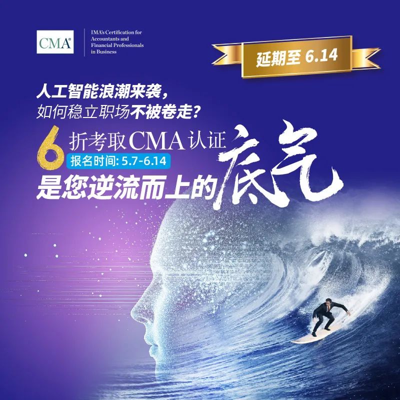 为助力财务专业人士深入学习管理会计,提升职场竞争力并拓展优质人脉,IMA协会推出的“人工智能浪潮来袭,如何稳立职场不被卷走?CMA认证是您逆流而上的底气”6折活动代码仅剩最后1,000个名额,活动延期至6月14日截止。名额有限,报完即止!请合理规划报名,切勿错过最后机会。