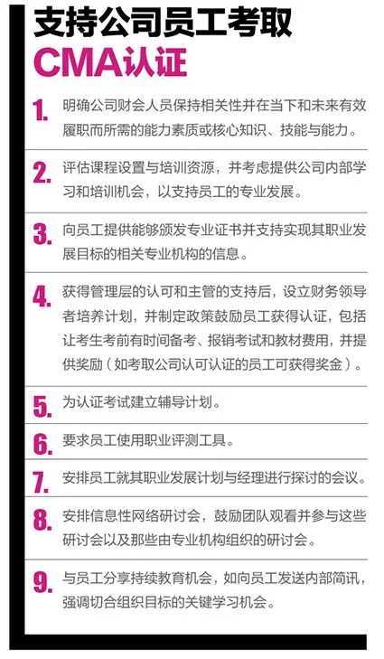 2005年Wolfenbarger加入卡特彼勒公司时,公司的CMA持证者相当少,而CPA很多。她研究了这两项认证,然后参加并通过了CPA考试,但未达到持证要求。后来,她把精力放在CMA认证上,而且她的直属上司(直接向CFO汇报)也很支持。公司为她支付了CMA备考费用和考试费,并准许她在每门考试之前专门用几天复习。她现在所在的公司欧文斯科宁也有类似政策。(“支持公司员工考取CMA认证”介绍了公司应该如何鼓励并帮助员工获得专业认证)