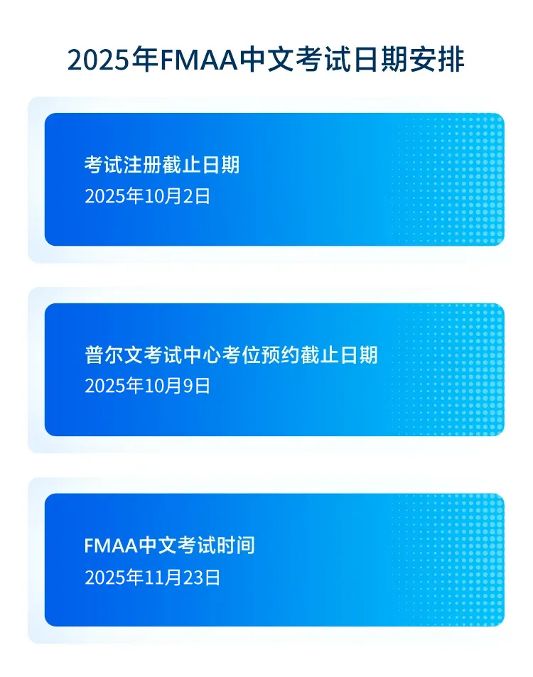 FMAA认证中文考试即将于2025年11月23日举行,并将于2025年10月2日截止报名,请您安排好报名时间。