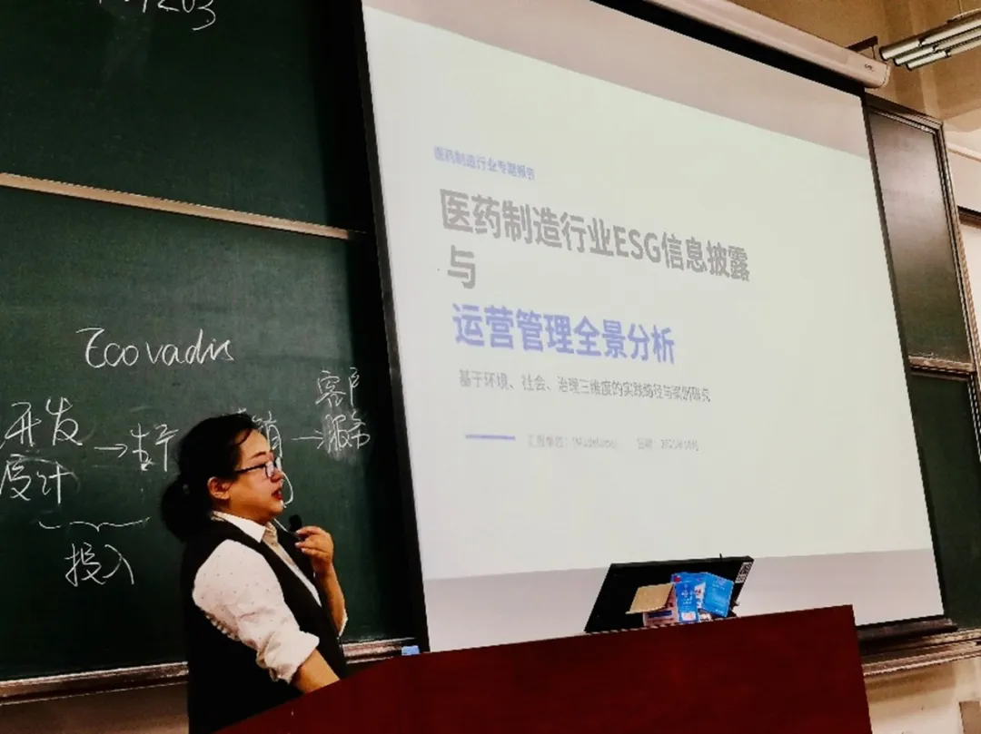 孟雨女士分别以“医药制造行业ESG披露与运营管理全景分析”和“可持续发展信息披露趋势中看财务人员职业转型”为题进行了分享。孟雨女士作为某生物医药公司财务总监、CMA注册管理会计师及多家行业协会ESG特聘专家,参与多项ESG及可持续发展行业标准的编写,具有丰富大型国有企业、上市公司可待续发展报告披露咨询经验。她指出,随着TCFD、IFRS等国际披露标准加速落地,企业可持续发展信息已从“可选项”变为“必答题”。在讲座中,孟雨女士从近期引发广泛关注的“始祖鸟‘炸山’事件”切入,剖析企业的环境责任与披露要求,并以生物医药产业链为核心案例,系统拆解了ESG理念在医药行业各环节的落地实践,详解了产品全生命周期中的ESG风险点与绩效提升路径,并强调科技伦理、供应链合规、销售渠道拓展的规范在企业ESG报告中的核心地位。